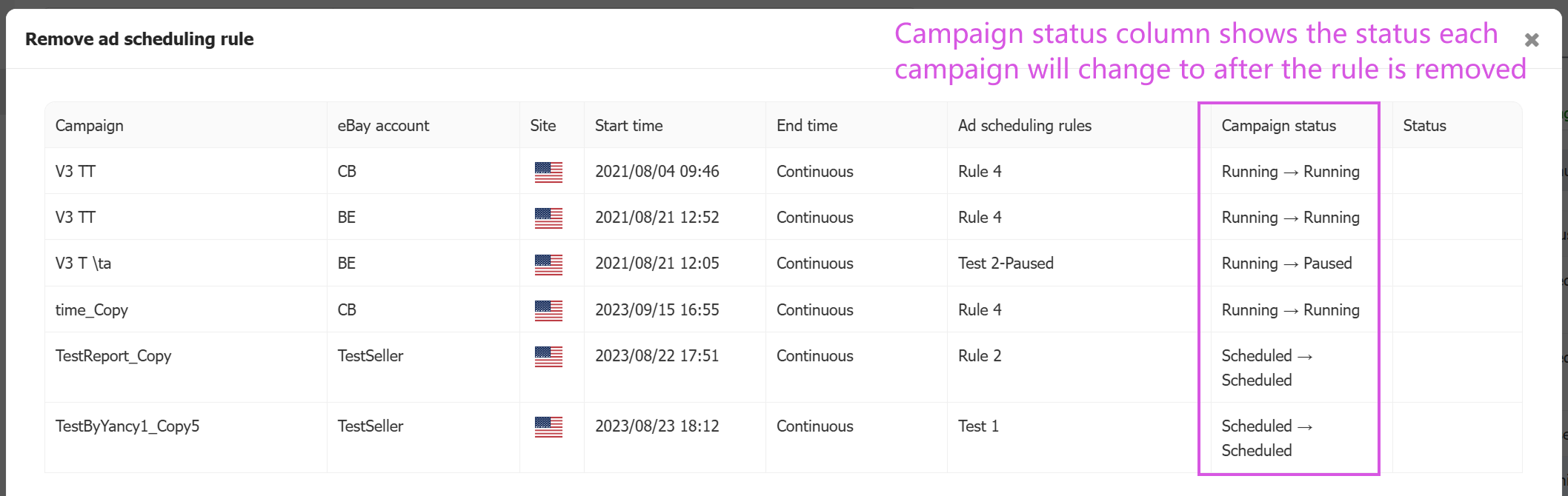 - Note: The Campaign status column shows the status each campaign will change to after the rule is removed. This behavior is configured on the rule setup page.