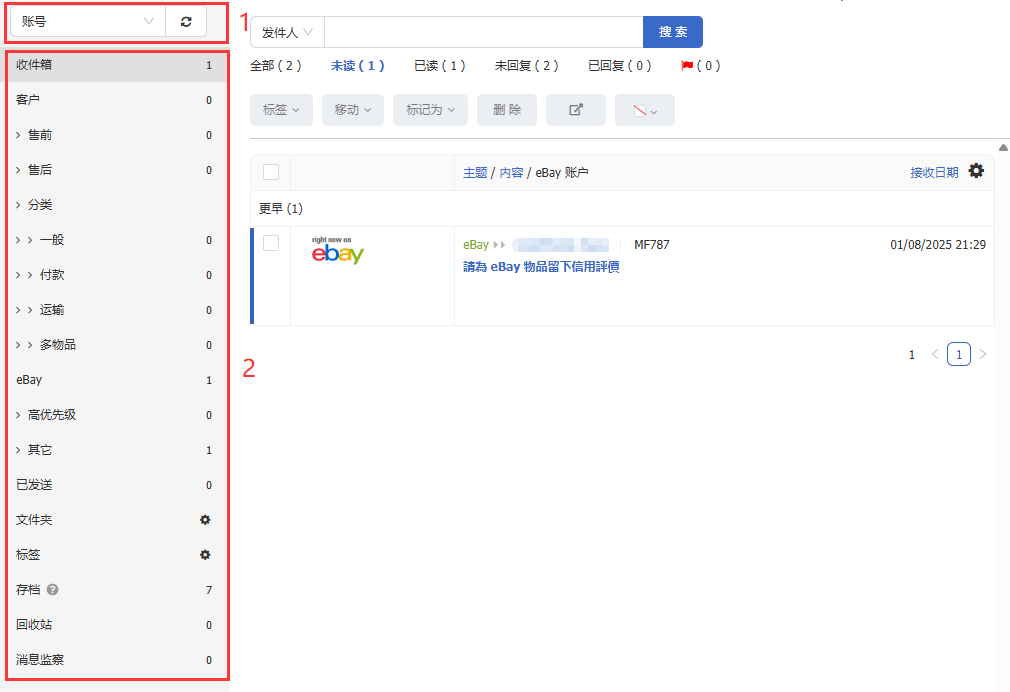 - 批量操作栏:批量处理,如打上标签、移至文件夹、标记为已读/未读/已回复、删除、在新标签页打开、标记颜色或同步eBay。