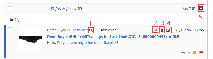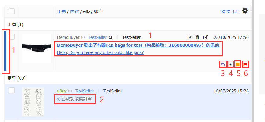 - 小红旗图标:表示该消息在eBay上被标记,此状态由eBay同步而来。