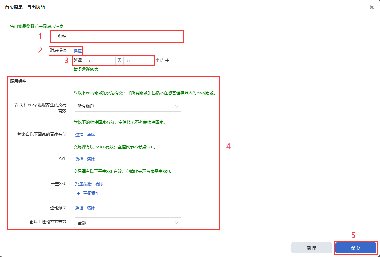 4)設置應用條件(包括eBay賬戶、國家、SKU、平臺SKU、運輸類型、運輸方式,空值代表不考慮該條件);