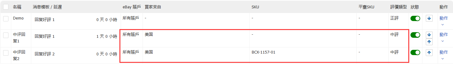 - 第三條規則用於中評,應用條件是美國買家+指定SKU:BCX-1157-01,其他條件不限制。