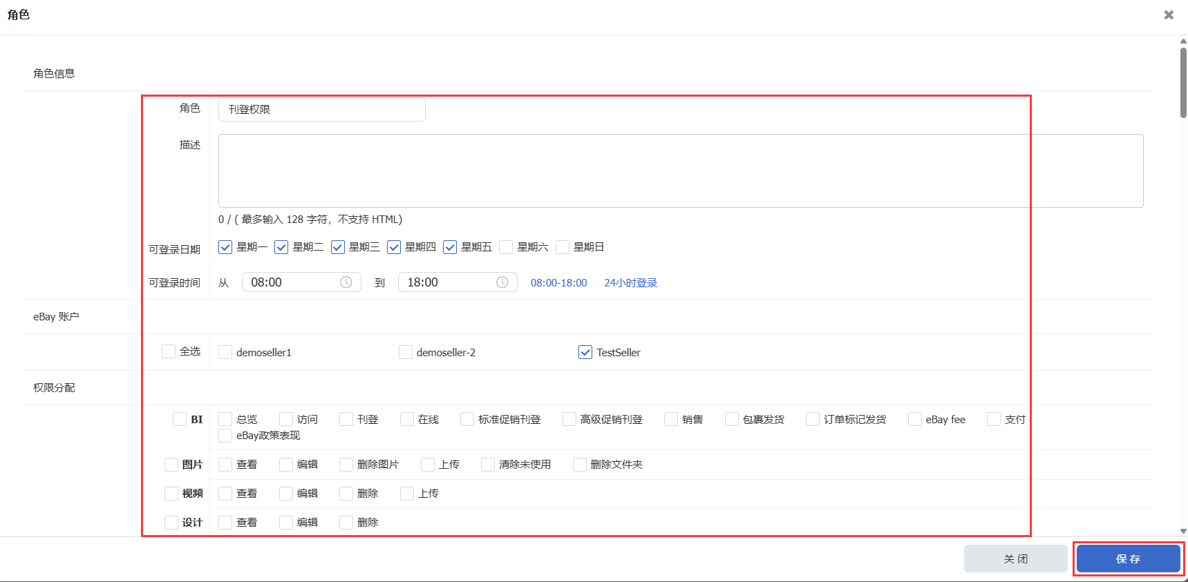 第二步:输入角色信息 > 勾选eBay 账户 > 勾选权限分配 >【保存】。