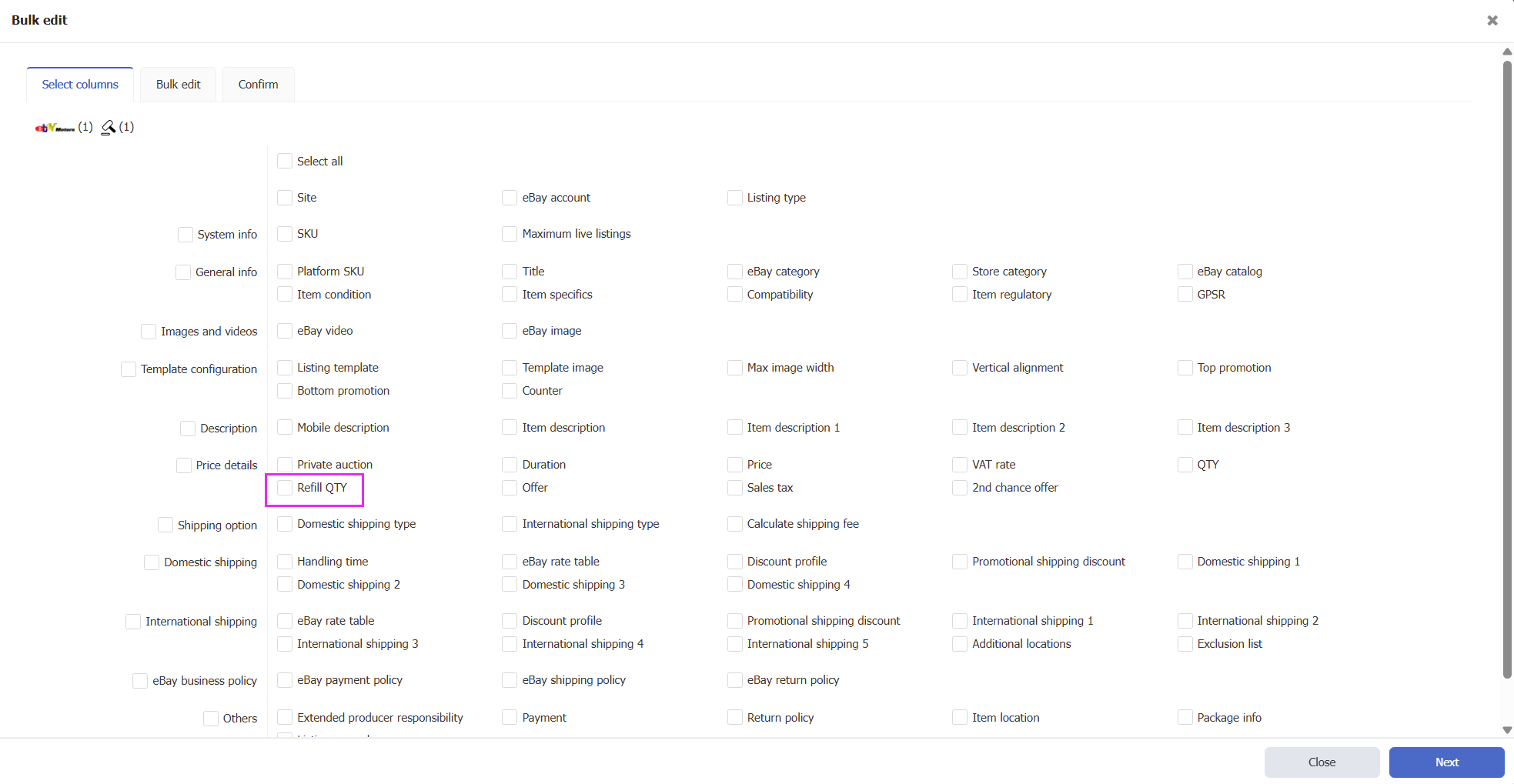 Refill Quantity: For listings with an Automatic rule applied, if the rule is set to “Use listing’s refill quantity”, the system will automatically update the online quantity to the value set in the listing once inventory drops below the threshold. Now, this field can also be modified in bulk editing.
