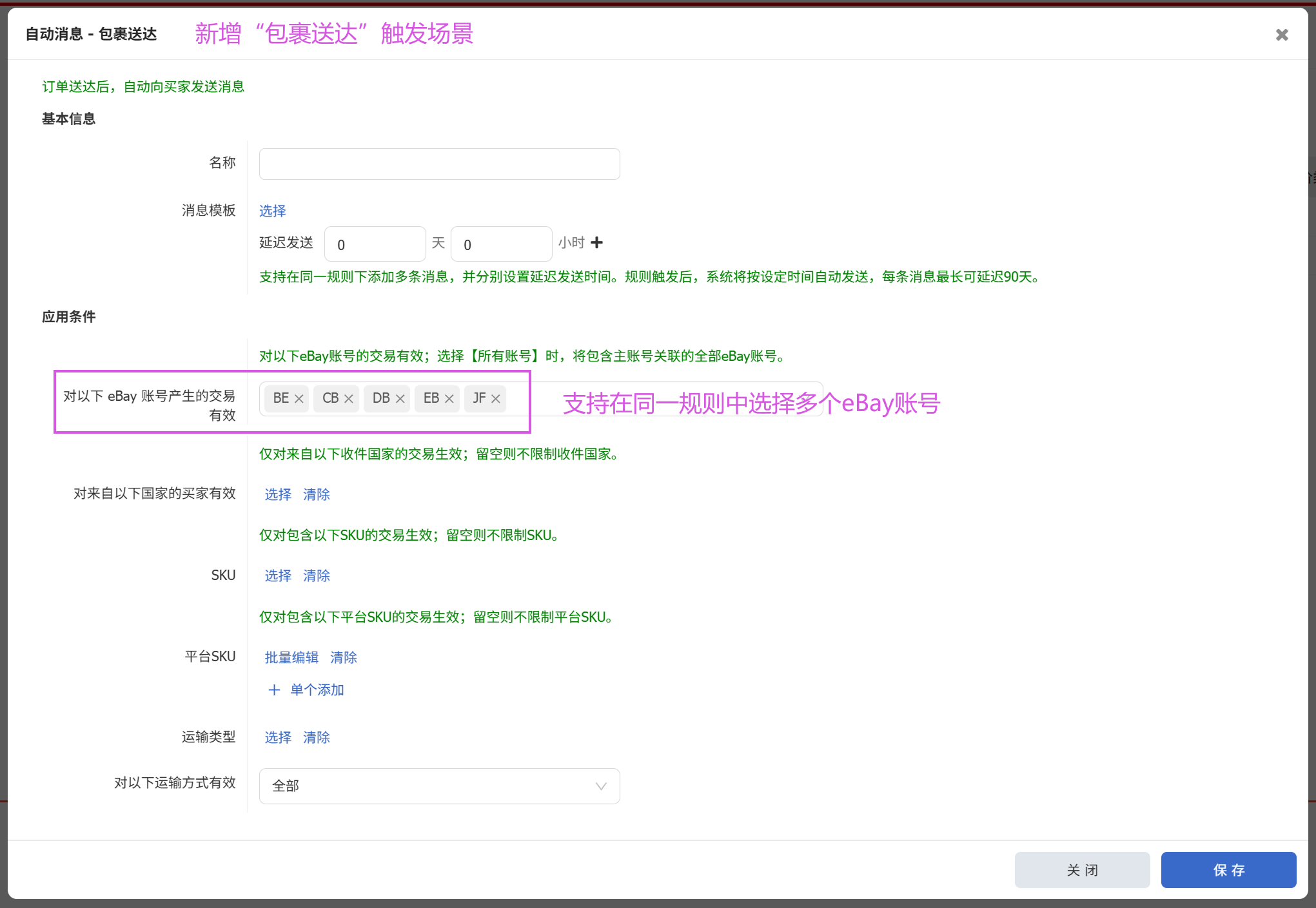 自动消息新增“包裹送达”触发场景,并支持在同一条规则中勾选多个eBay账号,相同内容的规则仅需创建一次即可应用到多店铺;