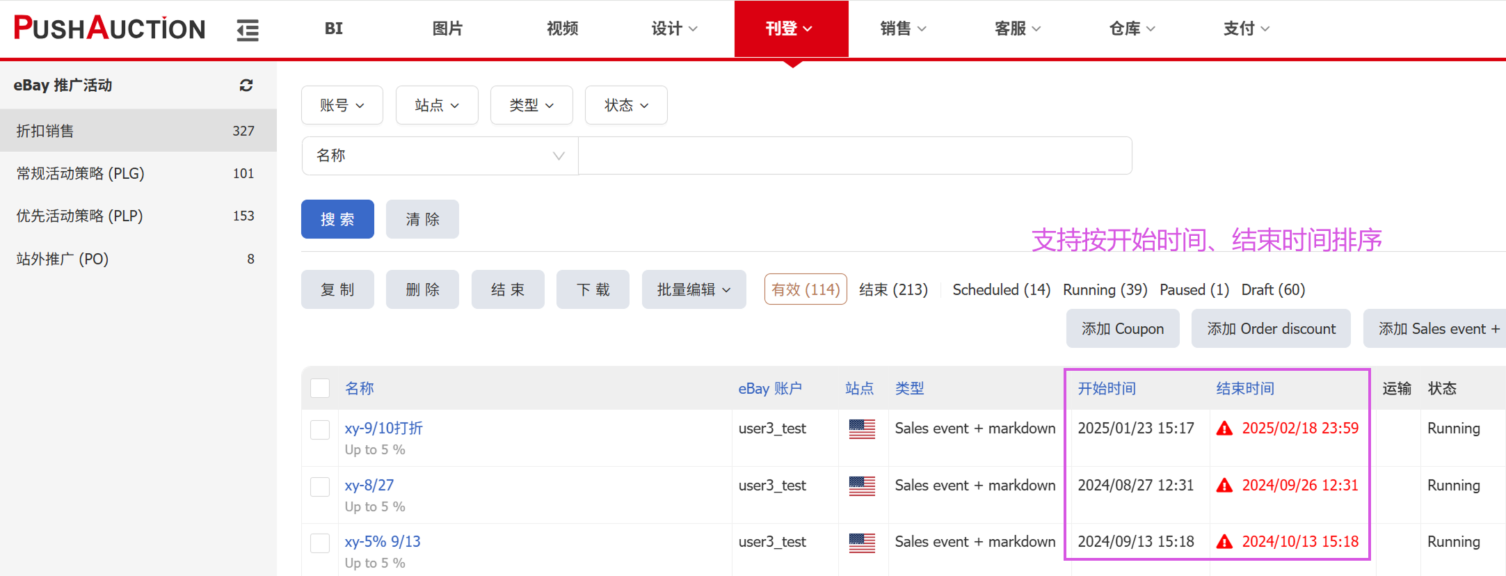 折扣销售页面,支持按开始时间、结束时间正序/倒序排列,方便快速查看哪些活动即将到期并提前调整策略;
