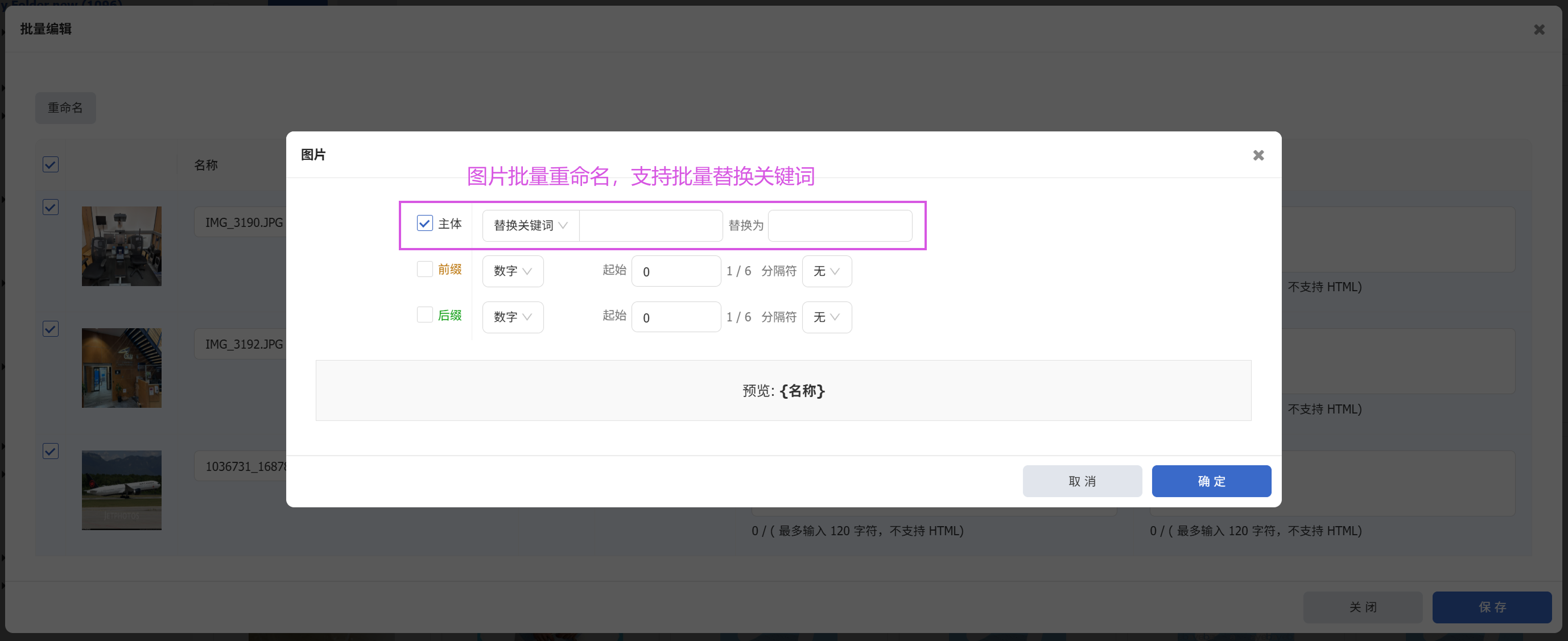 在批量编辑图片时,可一键替换指定关键词并预览效果,快速生成统一规范的图片名称。